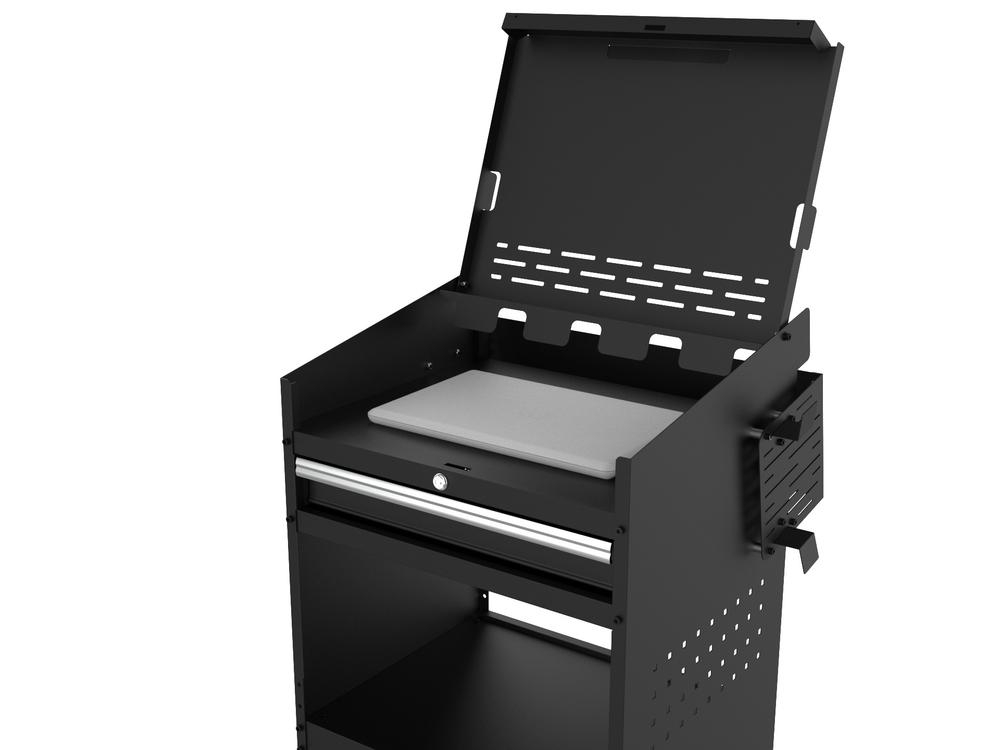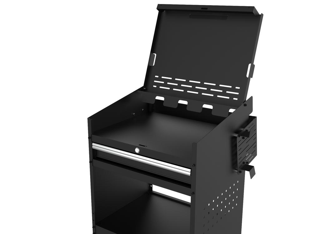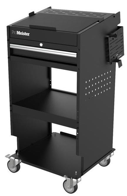 Enkel åpning og lukking av lokket. Låsbar skuff og oppbevaringsrom. 2 oppbevaringsområder under skuffen. Sklisikkert deksel på toppen for datamaskinen, padden eller diagnoseutstyret. Myk lukking av lokket. Kabelholdere på begge sider. 4 svingbare hjul, hvorav 2 med lås, gjør vognen enkel å manøvrere i alle retninger. Knock-down-design, "flat pakke". Reduserer emballasjevolumet med 50 %, enkel montering. Lakkert med svart, ripebestandig pulverlakk.