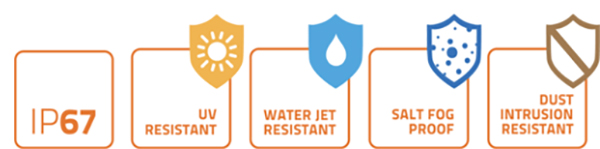 Hertz Marine sertifisert produkt med IP67 beskyttelse. ASTM-DA4329 standard UV bestandig og ASTM-B117 salt/fukt bestandig.