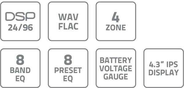 Innebygd DSP på 24bit/96kHz og et utvidet frevensbånd opptil 40kHz for høyoppløselig lydnytelse. 4 par linjeutganger hver med uavhengig subwooferutgang som gir mulighet til å skape opptil 4 uavhengig kontrollerte lytteområder for å oppnå den perfekte lyden overalt. 8 bånds digital equaliser for å få den beste lyden. Leveres med 8 forhåndsprogrammerte innstillinger laget av Hertz lydtekniker. Spenningsindikator for å ha full kontroll på batteristatus til enhver tid. Den store 4,3" TFT IPS-fargeskjermen forblir synlig selv under navigering på dagtid, og kan dimmes for komfortabelt nattsyn.