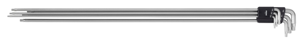 L-nøkler TX, ekstra lange. Montert på en praktisk holder med tydelig merking. Størrelser: T25, T30, T40, T45, T50. Lengste nøkkel er 650 mm.
