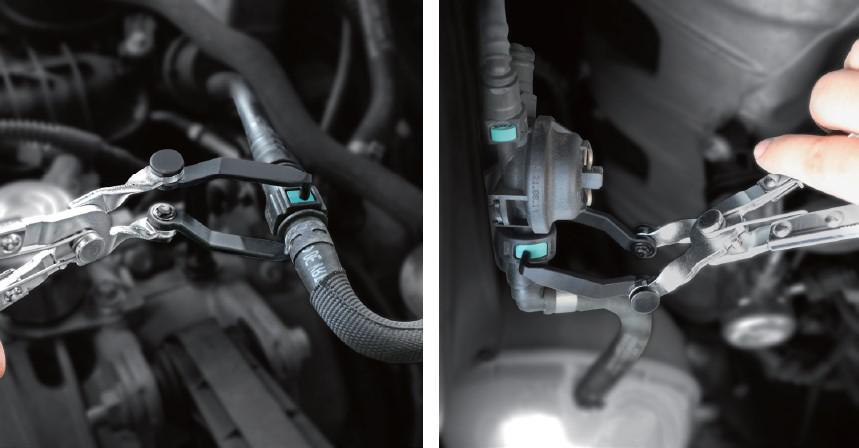 For å demontere hurtigkoblinger og glidelåskoblinger på drivstoffledninger. To knapper må trykkes inn samtidig på hver side av koblingen. Kjevene er justerbare for bedre tilgang på trange steder.